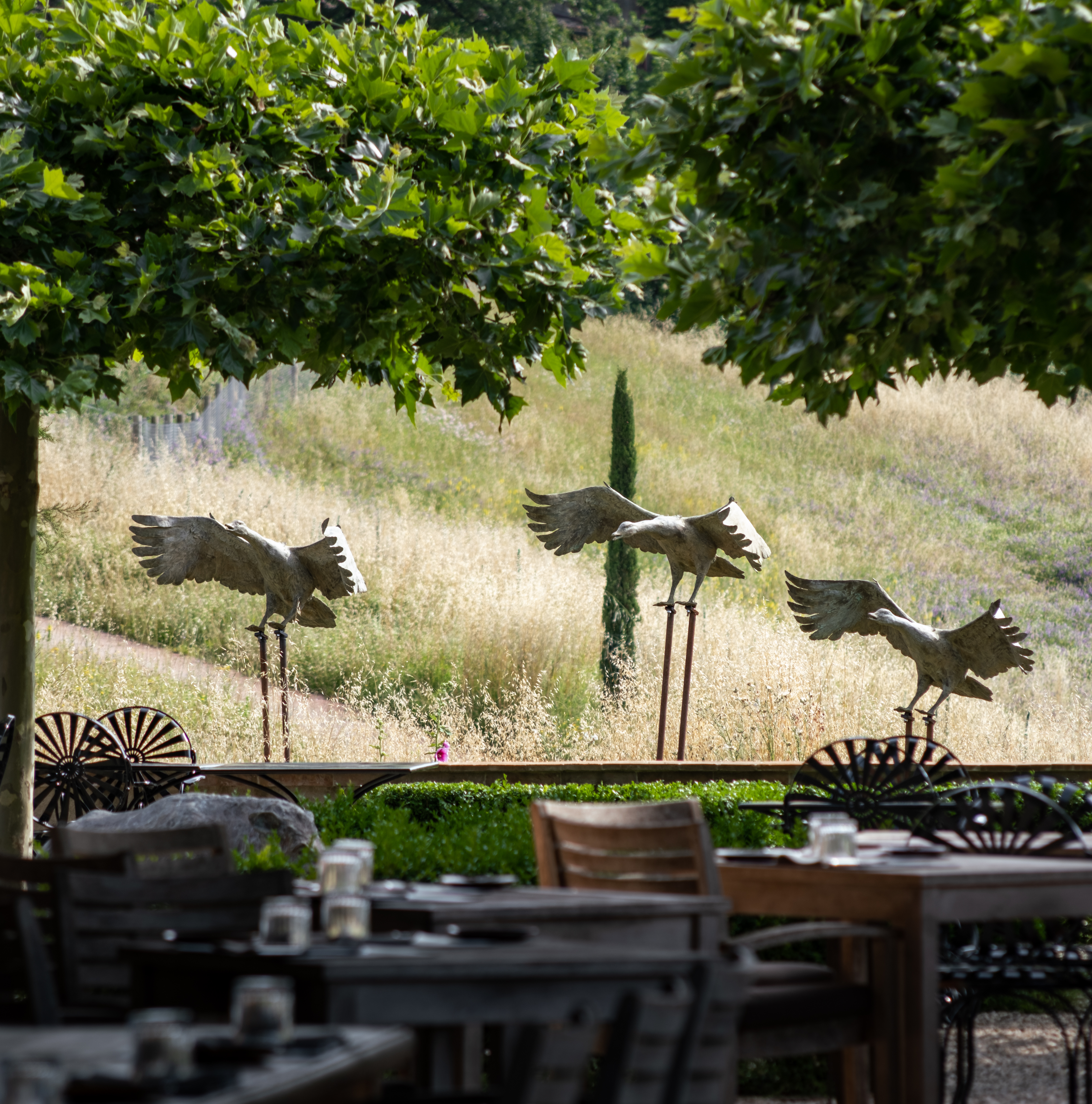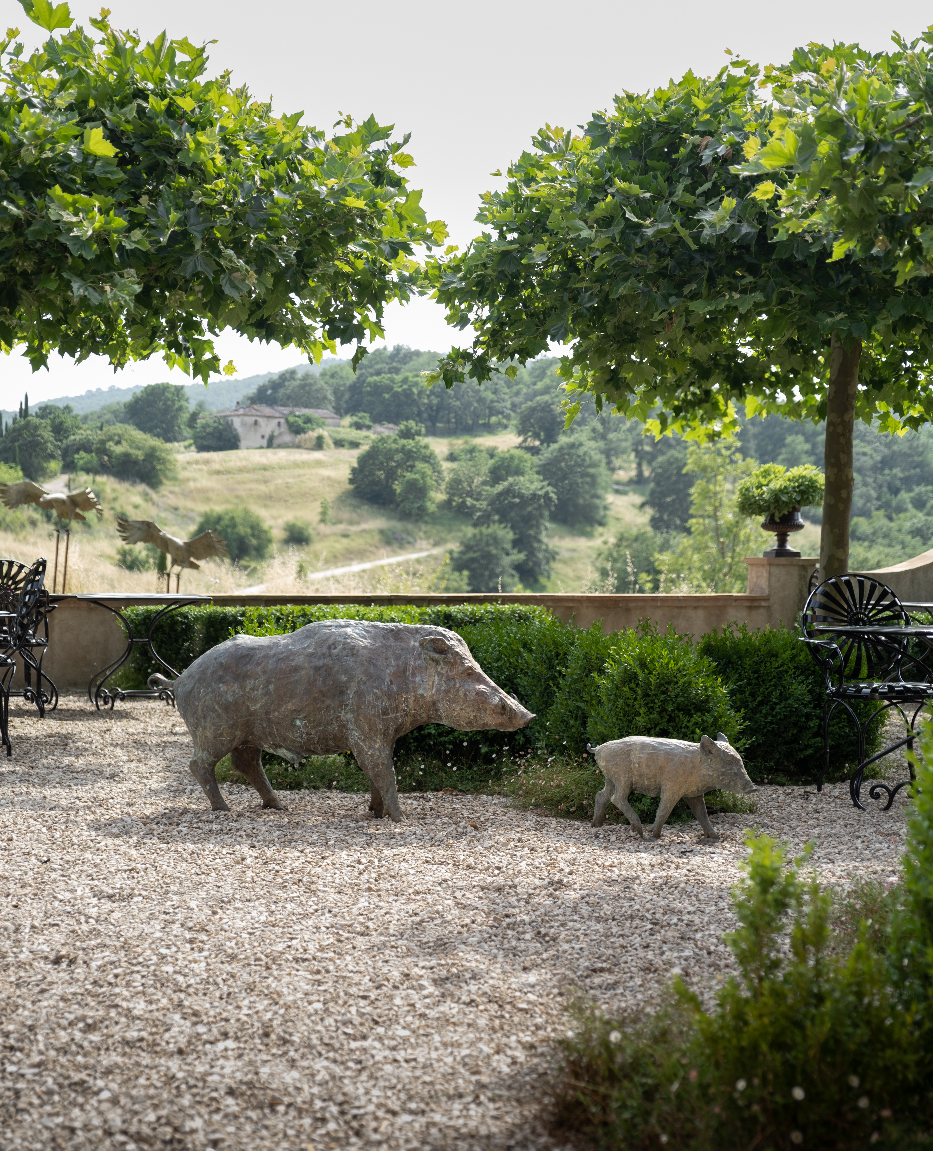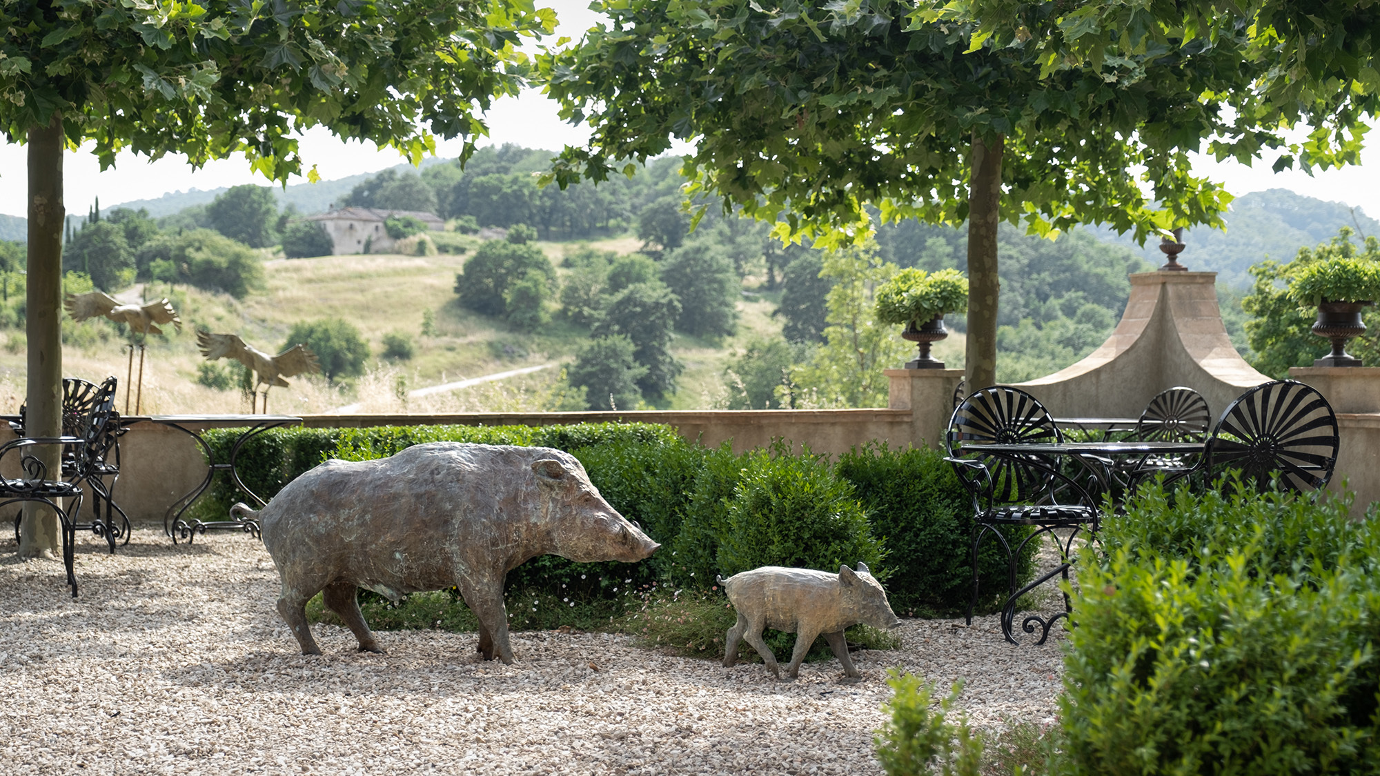 | Within the walled garden of the Ristorante Alle Scuderie are a number of Calyxte Campe's life-size sculptures from his exhibition "My Family and Other Animals". The Umbrian wild boar, the exotic ostrich and kangeroo - all the wildlife reflect their own whimsical personalities. Calyxte takes commissions for people or animals and all of the sculpture on display is available for sale with prices quoted to include global shipping. |