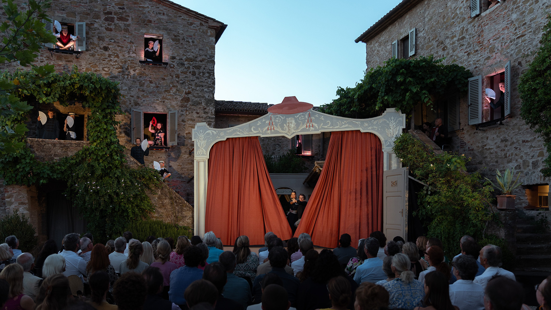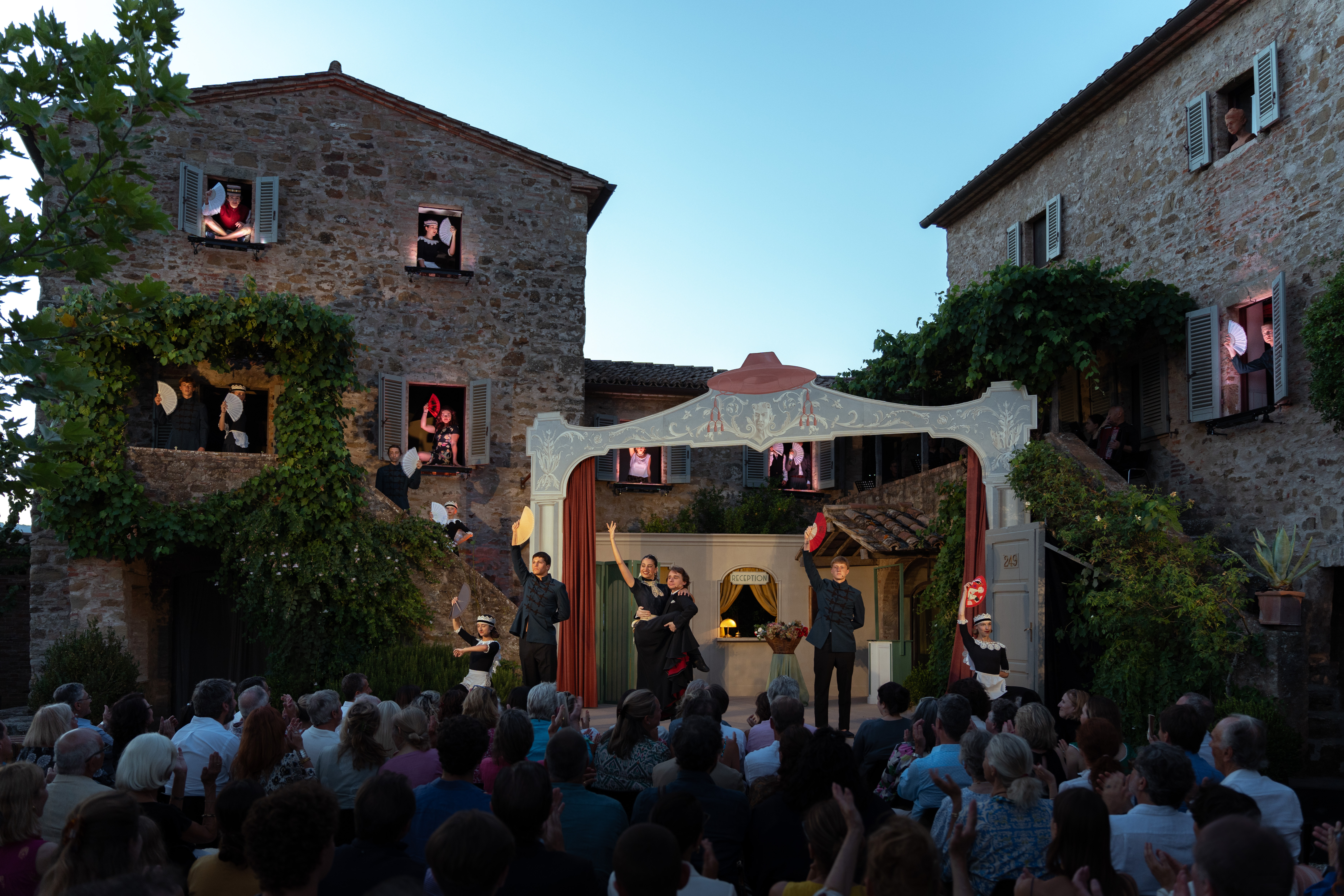 The Reschio Open-Air Theatre is a cherished tradition. Each July, a stage is set in the garden of Casa Giuntarelli, where the Reschio Players — a troupe of travelling actors — perform their original play over three consecutive nights. Laughter and applause are guaranteed, and all proceeds are donated to the Mascarade Foundation in Florence